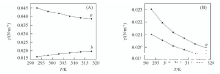 溶有萃取劑時,不同稀釋劑體系中界面張力隨溫度升高的變化趨勢明顯不同(見圖7)。首先,萃取劑的存在會使體系的界面張力明顯降低;其次,萃取劑/脂肪烴正辛烷體系的界面張力隨著溫度的升高緩慢上升;而萃取劑/芳香烴苯體系的界面張力隨著溫度的升高逐漸下降。稀釋劑種類不同時,界面張力隨溫度的變化趨勢明顯不同,反映了界面層結(jié)構(gòu)受溫度影響的不同。通常情況下,加入萃取劑后,隨著溫度升高TODGA分子在界面上與水分子的結(jié)合力降低,導致其聚集濃度下降;同時,溫度的升高對TODGA分子在界面上的締合有影響,導致其締合狀態(tài)不穩(wěn)定,降低其聚集濃度。這兩者均導致界面張力隨著溫度的升高而增大,并且大于溫度升高熱運動對界面分子間作用力的影響;對于芳香烴稀釋劑體系來說還存在另一個重要影響因素,即苯環(huán)上π鍵的存在。隨著溫度的升高,苯環(huán)上π鍵與界面萃取劑分子上極性基團間的相互作用被破壞,使TODGA活度增大,進而增大了TODGA在界面上的聚集濃度,使得界面張力降低。相比較而言,芳香烴作稀釋劑時溫度升高對苯環(huán)上π鍵與萃取劑分子間相互作用的影響明顯大于其對前兩者的作用。