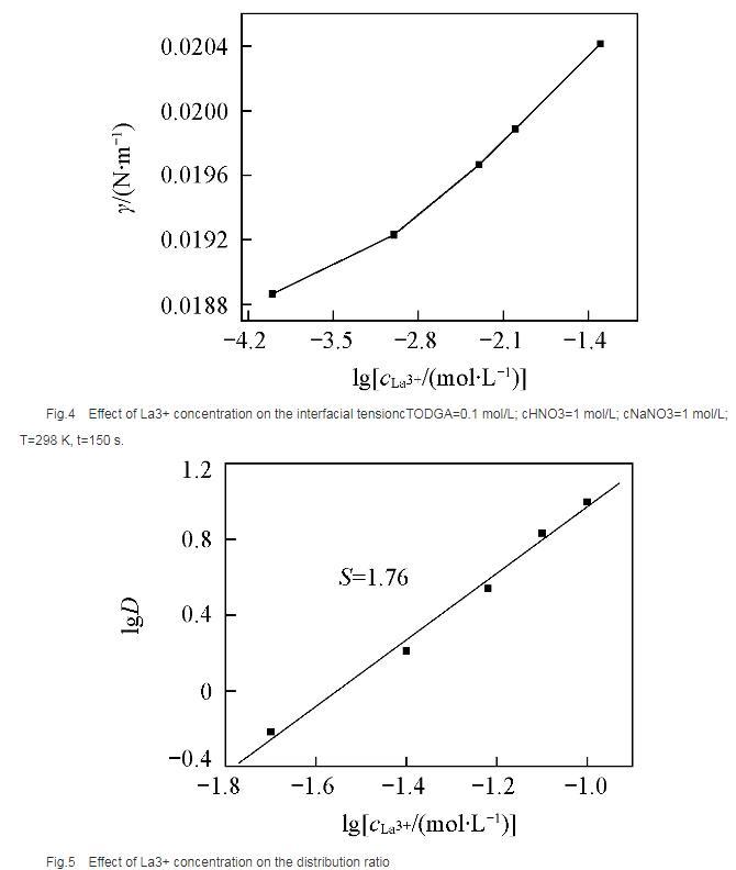在相同水相條件下,測定了萃取劑濃度對分配比的影響(圖5),根據(jù)斜率法得到萃合物的組成為La(NO3)3·2TODGA.位于界面區(qū)域的萃取劑與金屬離子形成萃合物,界面區(qū)域游離萃取劑分子減少,導致體系的界面張力增大。