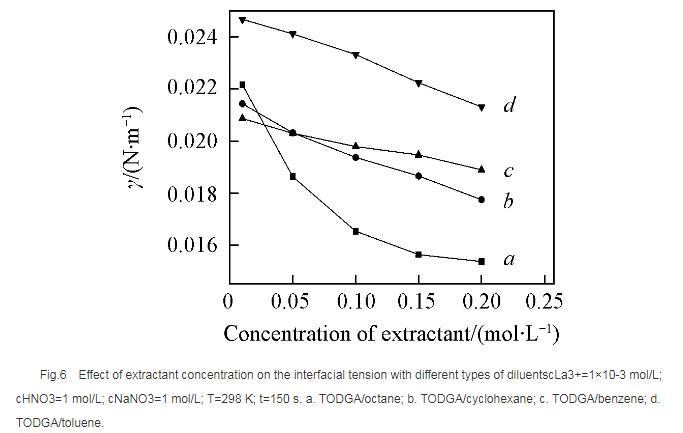 如圖8所示,以正辛烷作為稀釋劑時, TODGA/HNO3萃取La3+的界面張力隨著硝酸濃度的升高逐漸降低。根據(jù)文獻報道,在硝酸體系中, 3-氧戊二酰胺類萃取劑能夠萃取硝酸,萃取過程中隨著硝酸濃度升高,萃取分配比明顯增大。因此,硝酸濃度較高時TODGA與硝酸發(fā)生萃取締合作用,使中性萃取劑TODGA質(zhì)子化,其界面活性明顯增強,導致界面張力迅速降低,這與圖3結(jié)果一致。