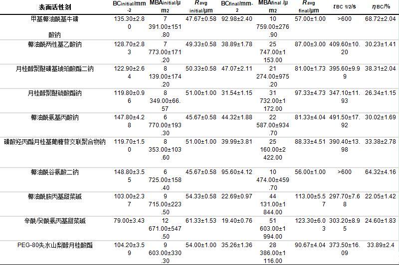 本研究除了測試表面活性劑溶液的表面張力、泡沫形態(tài)、泡沫密度保留率(ηBC)和泡沫體積保留率(ηV)外,還測試了最大泡沫含液量(Vliquid foam max)、析液半衰期(tFLS 50%)、氣泡個數(shù)半衰期(tBC1/2)、泡沫液體體積比率(MD)等指標,結(jié)果如表4和表5所示。