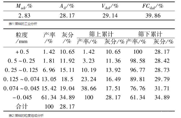 由表1、2可知,該煤樣水分為2.83%,灰分為28.17%,揮發分為29.14%,固定碳含量為39.86%。-0.045 mm粒級以下的煤泥產率為61.34%,灰分為34.89%,說明該煤樣中細粒煤占比大且灰分較高,煤樣為高灰細粒難浮煤泥。