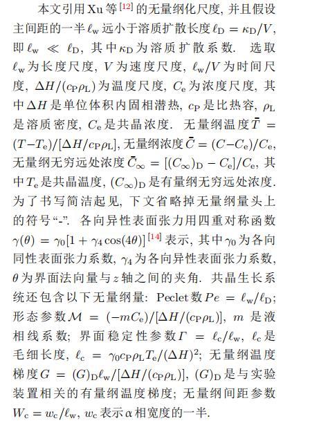 固體材料本身并非各向同性介質,其晶格結構使固體體內的物理量以及表面的物理參數依賴于取向,變為各向異性量.固體材料這些物理參量的各向異性特征對凝固過程動力學與界面穩定性機理以至對界面微結構圖案的形成與選擇造成重要的影響[14].王志軍等[15,16]研究了各向異性表面張力對定向凝固過程中初始平界面穩定性的影響,發現各向異性表面張力的非線性效應導致界面傾斜生長.Chen等[17]研究了各向異性表面張力對定向凝固過程中球晶生長的影響,發現在各向異性表面張力作用下,球晶生長初始階段部分界面首先向內移動,達到一定的熔化深度后向外移動.Xu[18]研究了各向異性表面張力對定向凝固過程中枝晶生長的影響,發現當存在各向異性表面張力時,枝晶系統具有兩種不同的整體不穩定性機理:震蕩不穩定性與低頻不穩定性.陳明文等[19]研究了各向異性表面張力對定向凝固過程中深胞晶生長的影響,發現當各向異性表面張力增大時,深胞晶界面全長增大,根部低端的曲率半徑增大.本文應用多重變量展開法研究各向異性表面張力條件下定向凝固共晶生長形態穩定性,揭示了各向異性表面張力對共晶生長不穩定性區域大小的影響.