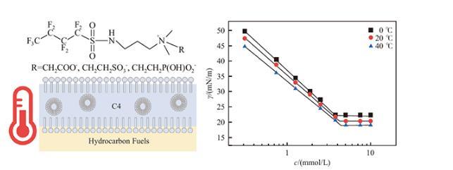 然而不同溫度對表面活性劑的性能可能有一定程度的影響。尤其是機場消防領域,由于我國機場分布較廣,消防車滅火需要就近取水,各機場在冬季和夏季的消防用水水源溫度差異較大(一般在0~40℃)。在低溫下氟碳表面活性劑的性能可能會受到影響,進而影響AFFF的滅火性能。我國國標中也僅對泡沫在室溫下的性能指標有所要求,并未嚴格考慮溫度的影響。因此,將溫度作為影響因素進行研究,能夠指導表面活性劑的有效應用。本文在溫度為0~40℃的范圍下,研究三種接枝不同親水基團的基于短碳氟鏈的甜菜堿型兩性氟表面活性劑的一系列理化性質,為此類表面活性劑在不同溫度環(huán)境下的應用提供理論依據。