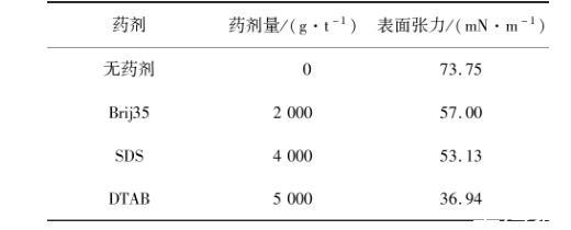 在浮選精煤過濾階段,濾餅中存在較強的毛細作用,水分難以排出。降低液相的表面張力可從根本上降低毛細力,使大量的毛細水從煤粒的間隙中排出。試驗對不加藥及3種藥劑最佳用量時濾液的表面張力進行測定,結果見表6。從表6可以看出,在不加藥時濾液的表面張力最高,為73.75 mN/m,比水的表面張力72.75 mN/m略高,其原因可能是浮選精煤表面殘留的浮選藥劑進入了濾液。在添加了表面活性劑后,3個濾液樣品的表面張力均有不同程度的下降。其中,添加Brij35的濾液表面張力較高,為57.00 mN/m,添加了SDS的濾液表面張力略低于Brij35,為53.13 mN/m,而添加了DTAB的濾液表面張力最低,僅為36.94 mN/m。表面張力的降低可顯著促進煤顆粒間毛細水的脫除。