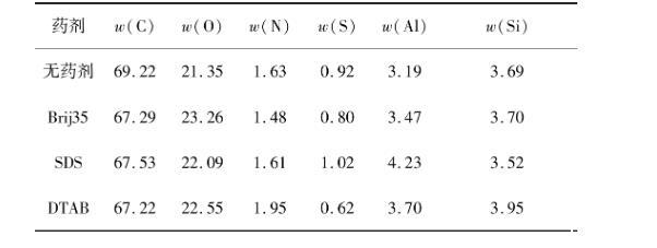 2)煤樣表面與3種表面活性劑作用后接觸角均有所降低。最佳藥劑用量時,SDS對煤樣表面接觸角的影響最顯著,降低了23°,DTAB和Brij35使接觸角降低10°。表面活性劑降低了煤樣表面C元素含量,增加了O元素含量。表面活性劑的非極性端與煤樣表面的疏水位點發生較多吸附,使表面活性劑的極性端指向外側,降低了煤樣表面的疏水性。