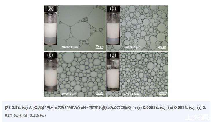 體系成份的濃度對乳液的外觀及粒徑有很大影響。圖3為固定0.5%(w)Al2O3顆粒濃度不變,研究在pH=7時不同MPA濃度對Pickering乳液的影響。隨著MPA濃度的不斷增加【0.0001%——0.1%(w)】,乳液下層析出的水相逐漸變澄清,說明MPA濃度增加,更多的Al2O3顆粒與MPA分子發(fā)生靜電相互作用,修飾后的Al2O3顆粒更容易從水相層中轉(zhuǎn)移到乳化層中,吸附在油水界面處,并且乳化層的高度也隨著MPA濃度的增加而升高,也說明更多的活性Al2O3顆粒參與乳化。乳液液滴粒徑隨濃度增加逐漸減小,從235.6μm降低到32.5μm,這是因為油水界面處的活性Al2O3顆粒的量逐漸增多,可以穩(wěn)定更多的Pickering乳液液滴。