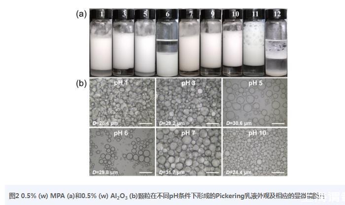當(dāng)pH=6時,親水性較強的MPA分子或Al2O3顆粒都不能形成穩(wěn)定的乳液,但兩者混合后,可以形成穩(wěn)定的W/O Pickering乳液,這可能是因為Al2O3顆粒被MPA分子經(jīng)靜電相互作用改性后疏水性增加導(dǎo)致的。進(jìn)一步增加pH(7<pH<11),穩(wěn)定性欠佳的O/W乳液轉(zhuǎn)變?yōu)榉€(wěn)定的O/W Pickering乳液,樣品瓶底部澄清的水層可以說明,此pH區(qū)間內(nèi),MPA分子和納米Al2O3顆粒相互作用較強,Al2O3顆粒幾乎全部參與到穩(wěn)定Pickering乳液,并且乳化層上面的泡沫層越來越高,乳液液滴的粒徑也逐漸減小。然而,當(dāng)水溶液為強堿時(pH=12),無法形成穩(wěn)定的乳液,這是因為部分Al2O3顆粒可以與強堿發(fā)生反應(yīng)生成可水溶的偏鋁酸鈉(NaAlO2)導(dǎo)致的。