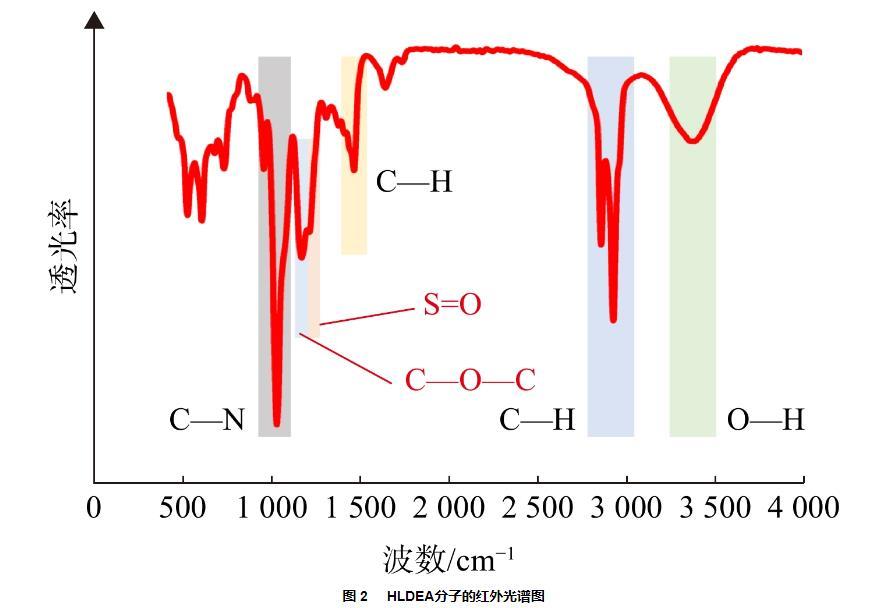 紅外光譜中峰的位置及形狀與分子中鍵的種類和環境具有對應關系,通過分析所得譜圖可得到物質的化學和結構組成的相關信息。圖2所示為HLDEA分子的紅外光譜圖。由圖2可知,合成后的HLDEA在3354.44 cm?1處出現O—H鍵的伸縮振動峰,2921.96 cm?1和2852.77 cm?1處的雙峰代表C—H鍵的伸縮振動峰,1463.05 cm?1處出現C—H鍵的彎曲振動峰,1028.50 cm?1處出現C—N鍵的伸縮振動峰,1215.97 cm?1處出現了S=O鍵的伸縮振動峰及1168.25 cm?1處C—O—C鍵的伸縮振動峰。C—O—C鍵和S=O鍵對應的振動峰來自生成的醚鍵和引入的磺酸根,這兩處峰的存在證明了反應成功發生,磺酸基團被接到LDEA分子上。