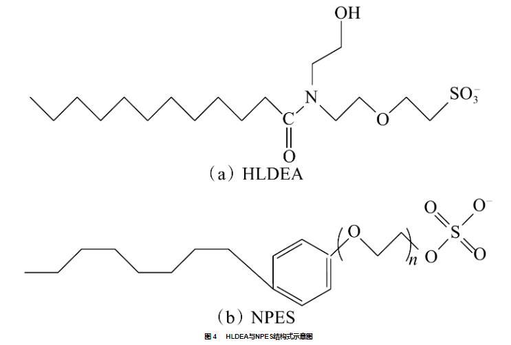將配制好的穩定性優異的復配體系[0.15%(w)HLDEA+0.15%(w)助表面活性劑]置于75℃條件下,測定復配體系的油水界面張力,結果見圖3。由圖3可得,復配后體系油水界面張力隨時間均出現先下降后基本保持平衡的趨勢。HLDEA與兩種陰非離子型表面活性劑APEC-4Na和NPES復配后體系的油水界面張力降低至接近超低界面張力水平(10?3 mN·m?1)。這是因為HLDEA分子小、親油性高,其擴散速度快且傾向于進入油滴內部,同時,溶液中的NPES分子隨時間推移逐步被吸引于油水界面,尾鏈與HLDEA分子相互糾纏形成緊密結構,提高了油水界面吸附膜的致密程度,從而使界面張力大幅降低。最終優選出的助表面活性劑為NPES,在與HLDEA復配后體系界面張力值為3.8×10?3 mN/m。HLDEA與NPES結構式見圖4。作為對比的超低界面張力體系油水界面張力值為2.9×10?4 mN/m,較HLDEA+NPES體系界面張力低了一個數量級。