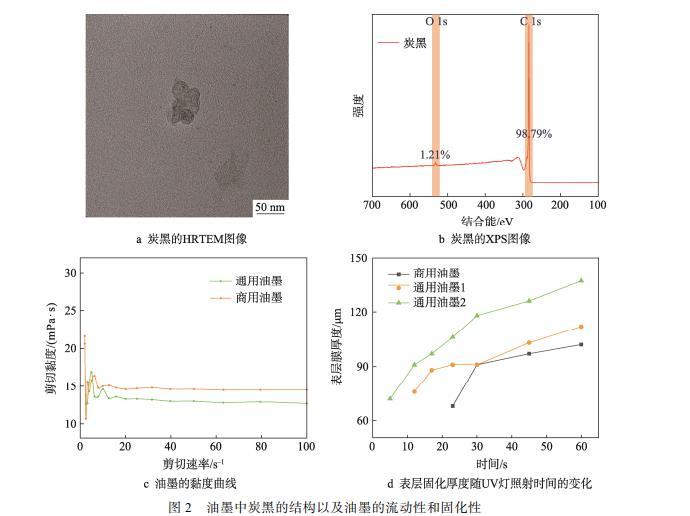 在制備油墨時(shí),需關(guān)注黏度、分散穩(wěn)定性和固化速度,確保噴碼順利。炭黑是關(guān)鍵組分,為避免炭黑團(tuán)聚導(dǎo)致穩(wěn)定性下降和打印堵塞,選擇粒徑適中的炭黑。粒徑過小易團(tuán)聚,過大可能堵塞,所選炭黑粒徑在50 nm左右,HRTEM圖像如圖2a所示。對(duì)所選炭黑進(jìn)行XPS分析,發(fā)現(xiàn)其氧含量高達(dá)1.2%,如圖2b所示。這一特性有望改善炭黑與油墨中極性液體的相互作用,從而進(jìn)一步提升油墨的穩(wěn)定性。炭黑的良好分散性不僅有助于提高油墨的穩(wěn)定性,還有助于降低油墨的黏度。如圖2c所示,通用油墨的黏度降至13.0 mPa·s,相比商用油墨的15.5 mPa·s下降約17%,黏度的降低更有利于噴墨打印的流暢進(jìn)行。