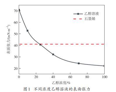 水和乙醇的表面張力分別為70.95 mN·m-1和22.17 mN·m-1,我們采用一定體積比的乙醇和水調配出與微晶石墨表面能接近的乙醇水溶液,并以此為溶劑球磨微晶石墨,研究溶劑的表面張力對球磨后微晶石墨粒徑的影響。從圖1可知,25%乙醇溶液的表面能為40.69 mN·m-1,與石墨烯的表面能(40.80 mN·m-1)相近,從圖2可知,其對應的微晶石墨中位粒徑最小。當溶劑的表面能與微晶石墨表面能相近時,微晶石墨能更好地分散在溶劑中,從而提高球磨效率。所以在本工作中,選擇25%的乙醇水溶液作為球磨溶劑。