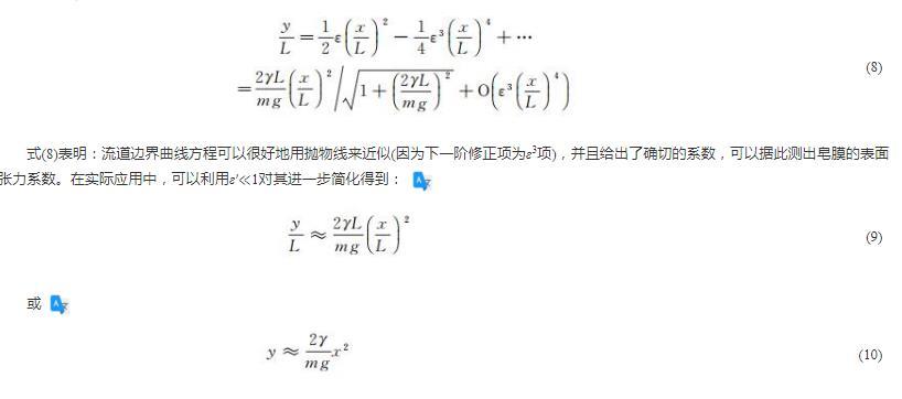 式(8)表明:流道邊界曲線方程可以很好地用拋物線來近似(因?yàn)橄乱浑A修正項(xiàng)為ε3項(xiàng)),并且給出了確切的系數(shù),可以據(jù)此測出皂膜的表面張力系數(shù)。在實(shí)際應(yīng)用中,可以利用ε′?1對(duì)其進(jìn)一步簡化得到: