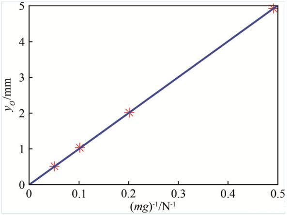 圖3給出了在同一皂液流量Q=35 mL/min下測得的流道中點(diǎn)O的位移隨砝碼質(zhì)量的變化以及根據(jù)式(11)擬合的直線。所有數(shù)據(jù)點(diǎn)都很好地落在過原點(diǎn)的擬合直線上,進(jìn)一步驗(yàn)證了本文推導(dǎo)的正確性。根據(jù)直線斜率測得的表面張力系數(shù)γ=27.1 mN/m,與前述拋物線擬合法得到的結(jié)果相近。