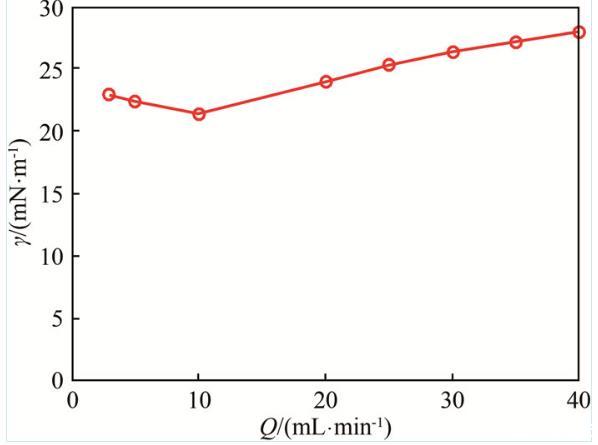 利用這一方法,還測量了表面張力系數(shù)隨皂液流量的變化關(guān)系,如圖4所示。圖中曲線并非如部分文獻(xiàn)報(bào)道的“表面張力系數(shù)隨皂液流量增加而單調(diào)下降”,這可能是由于表面張力系數(shù)隨皂膜厚度變化而有所變化、且實(shí)驗(yàn)中皂膜厚度并非均勻分布導(dǎo)致的。