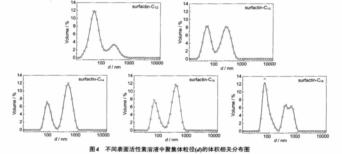 圖4不同表面活性素溶液中聚集體粒徑(d)的體積相關(guān)分布圖