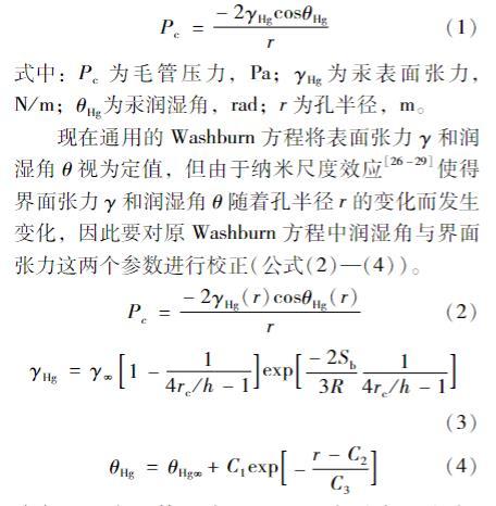 式中:Pc為毛管壓力,Pa;γHg為汞表面張力,N/m;θHg為汞潤濕角,rad;r為孔半徑,m;γ∞為孔半徑無窮大時汞的表面張力,γ∞=480 mN/m;θHg∞為孔半徑無窮大時汞的潤濕角(θHg∞=140°);Sb為吸附熱,Sb=Eo/Tb=93.99 J/(mol·k),Eo為蒸發(fā)焓,Tb為沸點;R為理想氣體常數(shù),R=8.314 J/(mol·k);h為有效分子或原子直徑,h=0.302 nm;rc為液滴曲率半徑,rc=-r/cosθ,nm;常數(shù)C1、C2、C3分別為18.345、1.719、2.711 7。