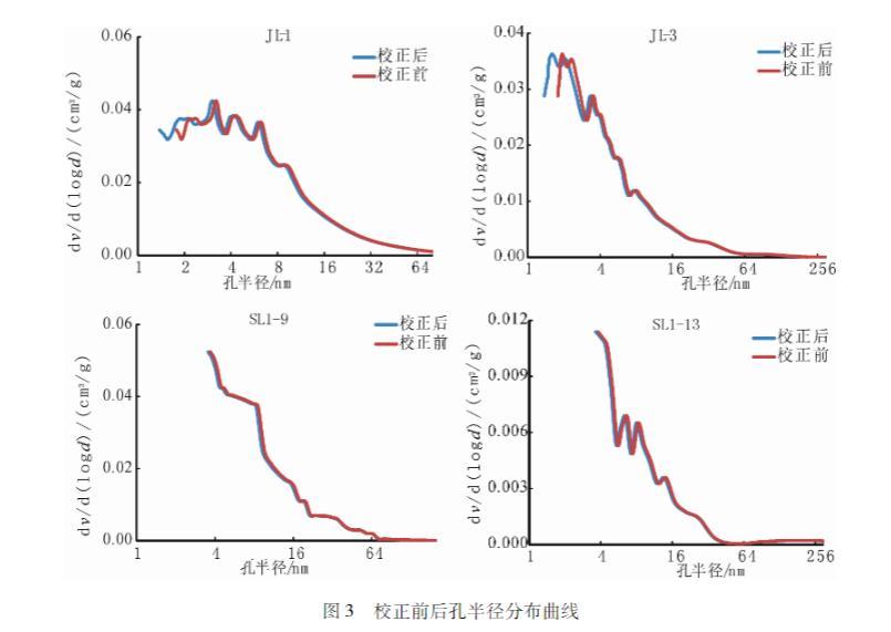 同樣應用參數校正前后的Washburn方程對松遼盆地青山口組JL-1、JL-3、SL1-9、SL1-13井的泥頁巖樣品的數據處理、對比發現——參數校正后的方程對于半徑為4 nm以下的孔有較大的影響,對于半徑為4 nm以上的孔基本上沒有影響(圖3)。