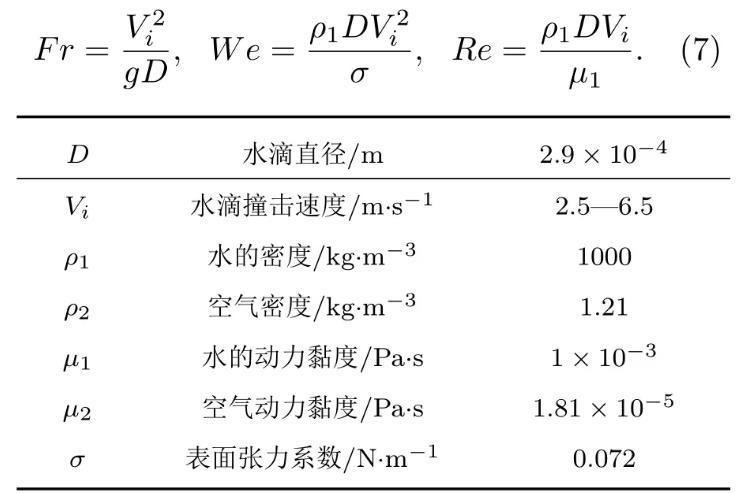 如圖1所示,水滴撞擊深水液池的數(shù)值模擬在軸對稱坐標(biāo)系中進(jìn)行,Y軸為計算區(qū)域的對稱軸,D為初始水滴直徑,R=D/2,正方形計算區(qū)域的長度H=20D,水滴距離液面的距離H1=0.1D,液池深度H2=12D以消除底部對液滴撞擊運(yùn)動的影響,水滴在重力g和撞擊速度Vi的作用下撞擊液池。采用雷諾數(shù)、韋伯?dāng)?shù)和弗勞德數(shù)來描述液滴撞擊的運(yùn)動特征,三者分別表征液體慣性力與黏滯力間的關(guān)系、液體慣性力與表面張力間的關(guān)系以及液體慣性力與重力間的關(guān)系。三個無量綱參數(shù)的表達(dá)式如(7)式所示,主要物理參數(shù)如表1所列。