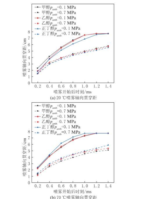 在試驗(yàn)中發(fā)現(xiàn),高溫高壓的環(huán)境對噴霧形態(tài)產(chǎn)生了較大的改變,相比于單種工況,環(huán)境溫度和背壓共同對噴霧形態(tài)有著更復(fù)雜的影響。圖8為3種醇類燃料在不同溫度(20℃、70℃、120℃)、不同背壓(0.1 MPa、0.7 MPa)的環(huán)境下,噴射壓力為20 MPa時(shí)的噴霧軸向貫穿距的變化。
