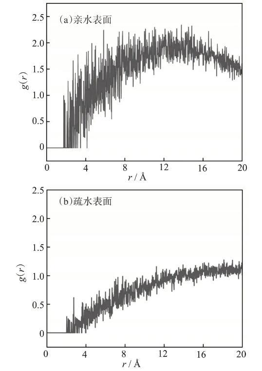 為了進一步揭示鼠李糖脂分子與親水、疏水表面之間的相互作用以及成鍵模式,計算了鼠李糖脂分子與不同潤濕性表面的徑向分布函數[g(r)]。計算以動力學模擬1000 ps后的穩定結構為基礎,結果如圖5所示。對于親水表面,鼠李糖脂分子距離1.3~2.0?的范圍內出現了明顯的峰,表明分子與該表面在此范圍內有新鍵生成,作用力較強。這主要是由于親水表面的羥基基團與鼠李糖脂親水環之間存在氫鍵作用。2.0?之后的峰主要由范德華力和靜電作用形成,從而產生了較高的吸附結合能(E=29.7 eV)。對于疏水表面,g(r)在2.0?之內均沒有明顯的峰,說明疏水表面與鼠李糖脂分子之間并沒有氫鍵生成,只有范德華力和靜電相互作用等弱作用力。這是由于疏水表面的十八烷基長鏈分布松散,與鼠李糖脂分子的相互作用較弱,在界面處疏水基團與鼠李糖脂分子間形成薄層空隙,導致結合能較低(E=12.2 eV)。