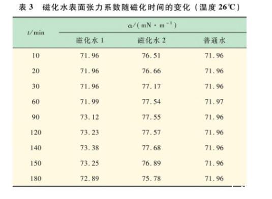 (1)從圖表可以看出,磁化水2在最初的前60 min內表面張力系數有了較大的變化,最大差值為7.8%