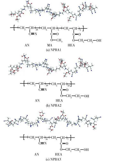 利用美國Accelrys公司Materials Studio軟件建立NPBA分子模型時,NPBA1聚合單元AN、MA和HEA的數目分別為20、5和5,NPBA2聚合單元AN和HEA的數目分別為20和10,NPBA3聚合單元AN和HEA的數目分別為28和7,NPBA分子模型上各類聚合單元均為隨機分布。此時3種NPBA分子模型的摩爾鏈節比分別為4∶1∶1、2∶1和4∶1,且相對分子質量均為2 300左右,使得所構建的模型與實際物質具有較好的對應關系。