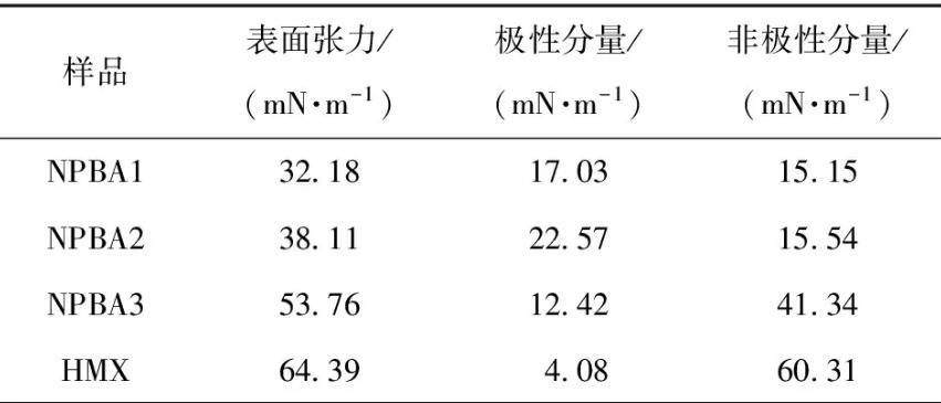 采用動(dòng)態(tài)接觸角測(cè)試儀的Wilhelmy吊片法和Modified washburn法,分別測(cè)試了合成的3種NPBA和HMX在不同液體中的接觸角θ,結(jié)果見(jiàn)表3.