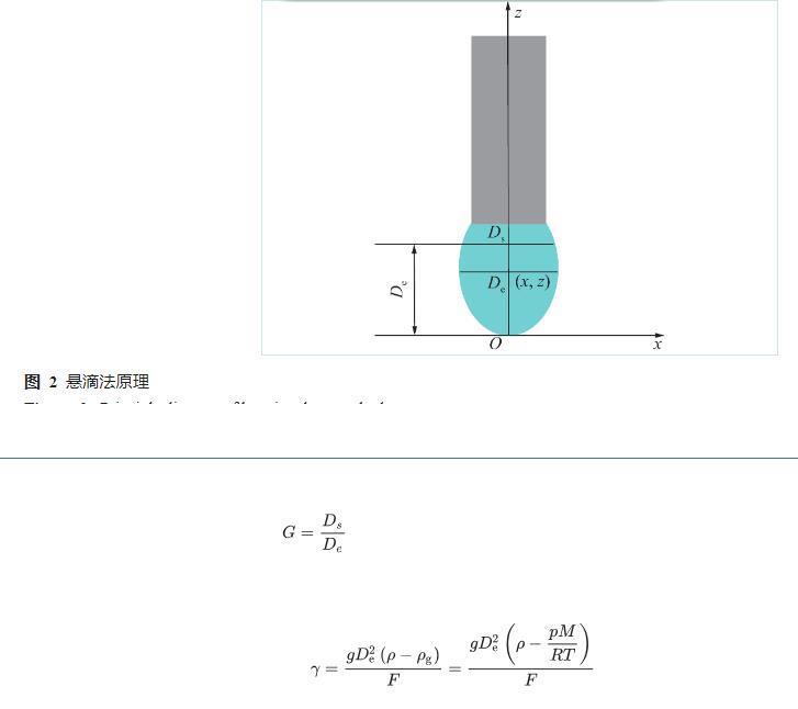 筆者采用懸滴法進行水與瓦斯之間表面張力的測試,當水滴被靜止懸掛在毛細管的管口處時,液滴的外形主要取決于重力和表面張力的平衡,通過對水滴外形的測定獲得水與瓦斯之間表面張力計算的相關參數。懸滴法原理圖如圖2所示,采用自開發的水與瓦斯之間界面張力分析軟件獲得式(1)中Ds、De,聯合水、瓦斯的密度、修正后的形狀因子(F)、重力加速度(g),基于式(2)計算水與瓦斯之間的表面張力。