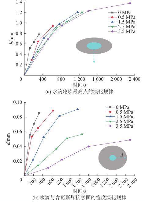 圖9水滴輪廓最高點及水滴與含瓦斯煤接觸面的寬度演化規律