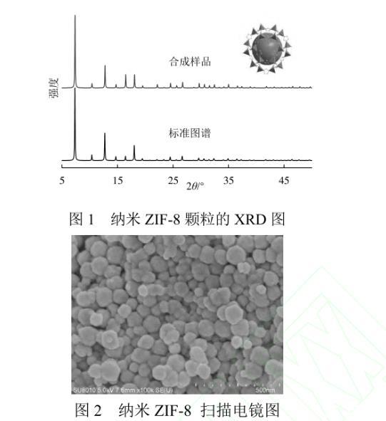 納米ZIF-8顆粒的XRD譜圖如圖1所示。合成的樣品譜圖分布與標準譜圖匹配,且所獲得的衍射峰與文獻吻合,未出現(xiàn)雜峰,表明制備的樣品具有單一相且結(jié)晶度良好。由謝樂公式計算得到晶粒尺寸約為70 nm。由納米ZIF-8顆粒的掃描電鏡照片可見,ZIF-8顆粒形貌為六邊形,平均尺寸為65.8 nm,與XRD計算結(jié)果一致。