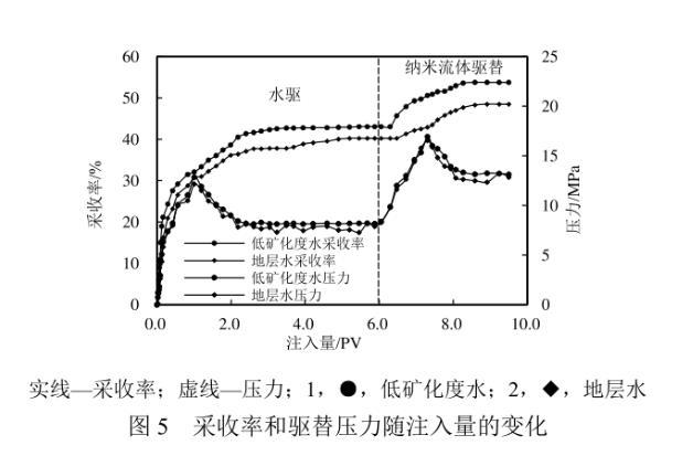 在驅(qū)油機理實驗探究的基礎(chǔ)上,優(yōu)選納米ZIF-8顆粒質(zhì)量分數(shù)為0.03%的納米流體進行巖心驅(qū)替實驗。采收率及驅(qū)替壓力隨注入體積的變化如圖5所示。使用模擬地層水、低礦化度水首次驅(qū)替至無油產(chǎn)出時的采收率分別為40.24%、43.06%。轉(zhuǎn)注含納米ZIF-8顆粒的流體后,受益于巖石表面潤濕性向著更加水濕轉(zhuǎn)變以及油水間界面張力的降低,油滴更易被剝落,且在流動過程中更易被注入液包裹形成乳狀液,增強了微觀驅(qū)替效率,從而使得最終采收率分別提高了8.25百分點和10.71百分點。注入納米流體后,驅(qū)替壓力得到了一定的提升。這可能是由于納米顆粒堵住了部分高滲通道,流體向孔滲條件較差的小孔隙流動,從而提高了波及效率,在一定程度上也有助于采收率的提高。