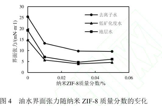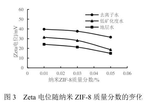 納米ZIF-8流體的穩(wěn)定性是評價其能否作為驅(qū)油劑的重要性質(zhì)之一。將裝有不同濃度納米流體的樣品瓶靜置15 d后,當ZIF-8的質(zhì)量分數(shù)為0.01%、0.03%時,納米顆粒在不同礦化度的流體中均保持穩(wěn)定狀態(tài),無沉淀生成,說明適當濃度的納米ZIF-8顆粒在水中有著良好的穩(wěn)定性。當ZIF-8的質(zhì)量分數(shù)為0.05%時,靜置后的納米流體產(chǎn)生了少量沉淀,表明過高濃度的ZIF-8會互相聚結(jié),導(dǎo)致顆粒變大,進而發(fā)生聚沉。