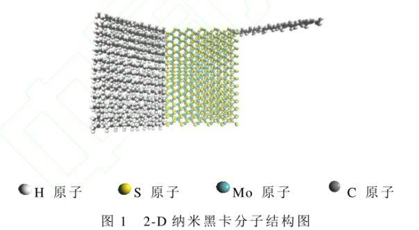 2-D納米黑卡具有雙層結(jié)構(gòu),由大小為30?×40?×12?的二硫化鉬納米片與直鏈烷烴構(gòu)成。假設(shè)理想狀態(tài)下二硫化鉬納米片無(wú)晶格缺陷,其活性位點(diǎn)位置確定可參見(jiàn)文獻(xiàn),且全部被C18H38直鏈烷烴接枝,如圖1所示。