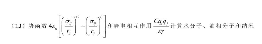 采用SPC/E模型描述水分子間相互作用,該模型中由于H原子質(zhì)量小,對(duì)水分子間的H—H和H—O相互作用可忽略不計(jì)。選取C10H22為油相,原子間的相互作用勢(shì)采用CHARMM勢(shì)函數(shù)來(lái)描述。VA8模型在研究二硫化鉬結(jié)構(gòu)和振動(dòng)特性時(shí)具有較高的準(zhǔn)確性,故選取其來(lái)描述納米片原子間的相互作用。以直鏈烷烴為改性劑改變納米片的親油親水性,采用CHARMM力場(chǎng)來(lái)描述原子間相互作用。采用6/12 Lennard-Jones(LJ)