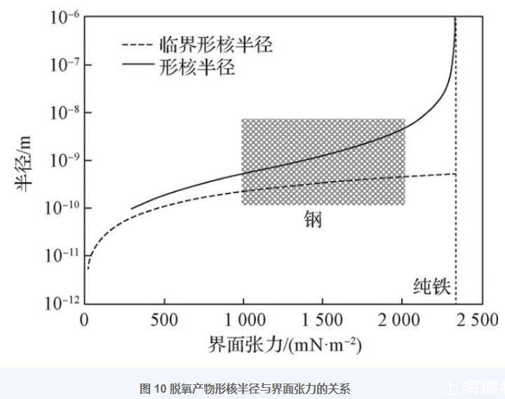 夾雜物與鋼液間的界面張力不僅會影響夾雜物的形核率,還會影響形核半徑的大小。以Al2O3為例,Al2O3的形核半徑和鋼液與Al2O3的界面張力的關系可以用式(10)來描述。