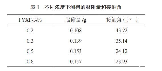 水與韓城煤粉的接觸角為73.23°。在不同濃度下測懸浮劑吸附量和接觸角,結(jié)果見表1。由表1可以看出,添加FYXF-3后,能大幅度地降低接觸角,接觸角隨著FYXF-3濃度的增大而減小,濃度大于0.5%后,減小幅度變小;吸附量隨著濃度的增大而增大,濃度大于0.5%后,增大的幅度變小。這說明FYXF-3濃度不小于0.5%時(shí),能較大地增加吸附量、減小接觸角,從而能有效改善煤粉表面的潤濕性能,防止分散的煤粉結(jié)塊而產(chǎn)生沉降,這樣有利于懸浮煤粉并將其返排。