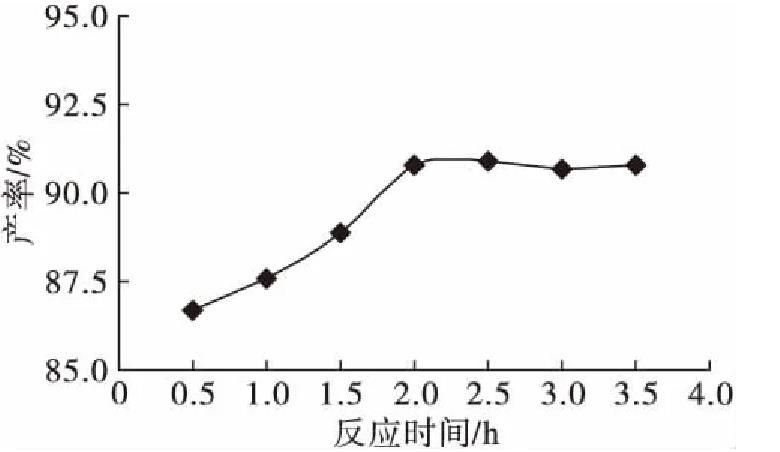 選取復合氨基酸溶液與椰油酰氯體積比4∶1、pH 11、反應溫度35℃、丙酮與復合氨基酸溶液體積比1.5∶1,根據反應時間對產物產率的影響趨勢,確定最適反應時間,結果見圖4。