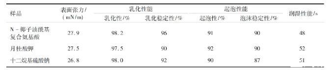 測定了以大豆粕為原料合成的N-椰子油酰基復合氨基酸產物表面活性性能,同時與陰離子表面活性劑月桂酸鉀、十二烷基硫酸鈉表面活性進行了比較,結果見表4。