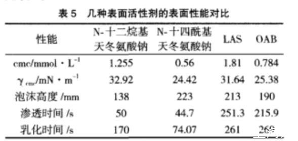 對(duì)N-十四酰基天冬氨酸鈉鹽的幾項(xiàng)表面性能進(jìn)行了測(cè)定,并與其他表面活性劑進(jìn)行了對(duì)比,結(jié)果見(jiàn)表5。