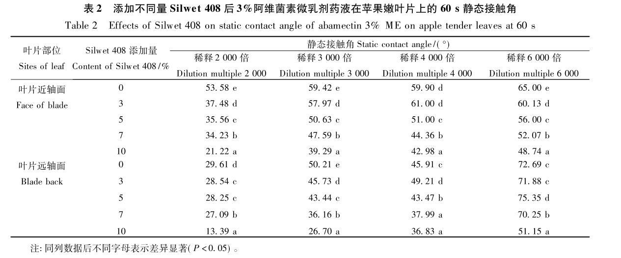 2.2添加不同量Silwet 408對阿維菌素微乳劑藥液在蘋果嫩葉片上靜態(tài)接觸角的影響