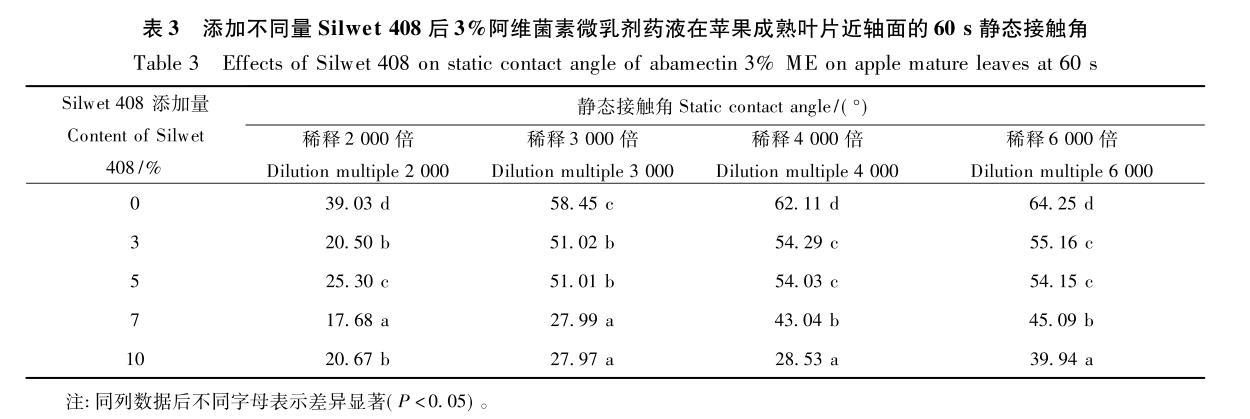 2.3添加不同量Silwet408對阿維菌素微乳劑藥液在蘋果成熟葉片上靜態(tài)接觸角的影響
