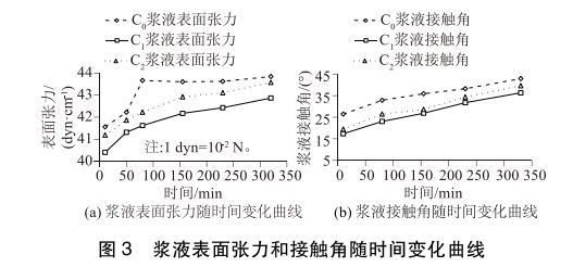將配制好的C0、C1、C2 3種漿液每隔一定時(shí)間取樣進(jìn)行表面張力和接觸角的測(cè)試。測(cè)得表面張力隨時(shí)間變化曲線見(jiàn)圖3(a),接觸角隨時(shí)間變化曲線見(jiàn)圖3(b)。