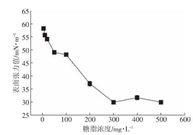 發(fā)酵產(chǎn)物臨界膠束濃度是指分子在溶劑中締合形成膠束的最低濃度。臨界膠束濃度(Critical micelle0.005 concentration,CMC)可以作為表面活性劑表面活性的一種度量,CMC越小,改變表/界面性質(zhì),起到增溶、乳化等所需的濃度就越低。從圖3可以看出:糖脂在0~300 mg·L-1時,表面張力值隨著糖脂濃度的升高而降低,且在300 mg·L-1時達到最小值;在300~500 mg·L-1時,表面張力值變化不大??傻冒l(fā)酵粗提產(chǎn)物的CMC為300 mg·L-1,明顯低于普通化學(xué)表面活性劑十二烷基磺酸鈉(SDS)的2200 mg·L-1,能在較低濃度下使用,因而在醫(yī)藥、食品、化工等行業(yè)具有廣闊應(yīng)用前景。