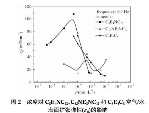 圖3濃度對C8E4NC12、C12NE3NC12和C8E4C8癸烷/水界面擴(kuò)張彈性的影響