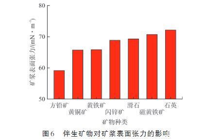 對礦漿濃度為30%的黃銅礦、方鉛礦、滑石、閃鋅礦及石英的礦漿表面張力進行了測定。在pH=7、粒度-0.074 mm占比80%的條件下,考察了黃鐵礦與磁黃鐵礦及伴生礦物質(zhì)量比為7∶3時,不同伴生礦物對礦漿表面張力的影響,結(jié)果見圖6。由圖6可知:不同礦物的礦漿表面張力存在差異,具體為石英72.17 mN/m、磁黃鐵礦70.72 mN/m、滑石69.31 mN/m、閃鋅礦68.88 mN/m、黃鐵礦65.89 mN/m、黃銅礦65.72 mN/m、方鉛礦59.14 mN/m。分析結(jié)果表明,方鉛礦的礦漿表面張力最低,而石英的礦漿表面張力與水的表面張力(72.80 mN/m)最為接近。