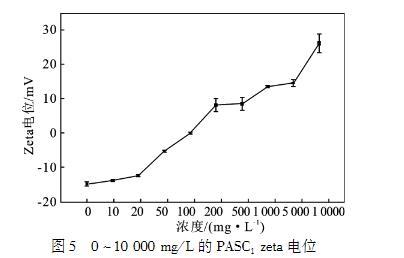 PASC1的絮凝效果見圖3、圖4.PASC1濃度為10——50mg/L時,透過率接近100%,繼續增加PASC1的濃度,體系重新變得渾濁。隨著PASC1濃度的進一步增加,體系的透過率降低,粘土顆粒懸浮體系重新穩定。粘土顆粒的表面由于同構取代而帶負電荷,這意味著需要陽離子達到電荷平衡。對于鈉基膨潤土(Na——BT),Na+離子被吸引到層空間中。當Na——BT與水接觸時,水可進入晶層內部,使可交換陽離子解離,在晶層表面建立擴散雙電層,從而產生負電性。