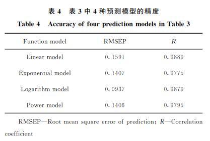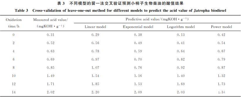 留一法交叉驗證是建立預測模型的一種常用方法,從N個觀測數據中選擇一個觀測數據作為驗證數據,然后使用剩下的(N-1)個觀測數據擬合一個模型,并用驗證數據來驗證模型的精度,如此重復N次??紤]到數據量以及相關性,筆者利用Excel建立了線性、指數、對數、乘冪4種預測模型,對小桐子生物柴油酸值的預測結果見表3。