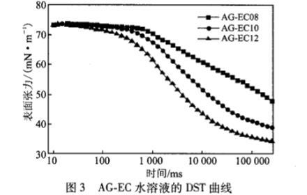 由圖3可知,對(duì)于不同鏈長(zhǎng)的AG.EC水溶液,其DST曲線都是微微下降一快速下降一緩慢平衡的過(guò)程。另外在疏水鏈變長(zhǎng)的同時(shí),DST曲線的誘導(dǎo)期時(shí)間縮短,DST下降趨勢(shì)增加,介平衡狀態(tài)表面張力值越低。這是由于疏水烷基鏈增長(zhǎng)使得表面活性劑的疏水性增強(qiáng),更容易吸附到溶液的表面。
