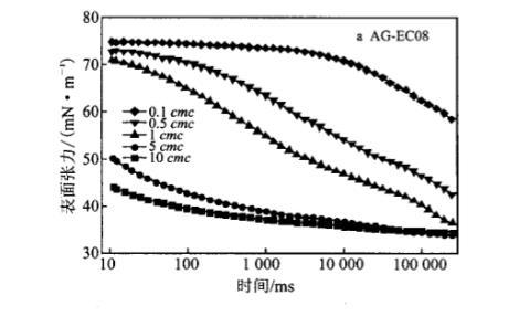 2.2.1烷基糖苷檸檬酸單酯二鈉鹽的烷基鏈長(zhǎng)對(duì)其水溶液動(dòng)態(tài)表面張力的影響圖3為不同烷基鏈長(zhǎng)的AG-EC水溶液(2.26mmoL/L)的DST隨時(shí)間變化的情況。