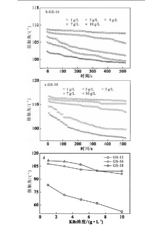 在KBr濃度區間1~10 g/L內,GS-12隨著KBr濃度的增加,接觸角顯著減小,而GS-16和GS-18則變化不明顯??梢越忉尀?對于GS-12而言,KBr濃度越高,固/液界面處的填料越緊密,導致氣/液固界面張力值降低,而疏水鏈較長的GS-16和GS-18其自身降低界面張力的能力有限,所以,隨KBr濃度增加,接觸角變化有限[1,19]。此外,隨著KBr濃度的增加,液滴在石蠟膜上的接觸角值減小。